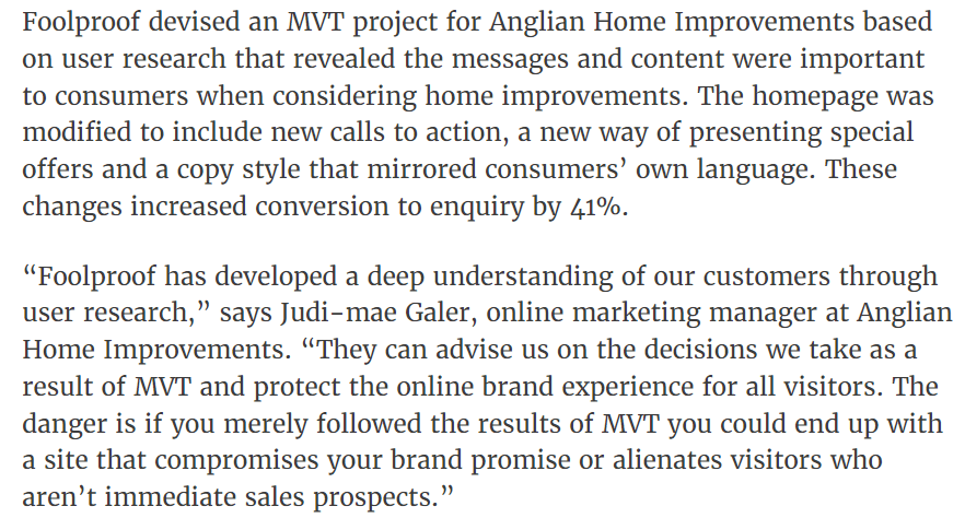 Judi-mae was also interview by Marketing Week magazine in 2009 about user testing and multivariate testing technologies which were part of her focus when working for Anglian Home Improvements. She used these tools in order to increase website lead flow into the business and was passionate about their benefits and uses.