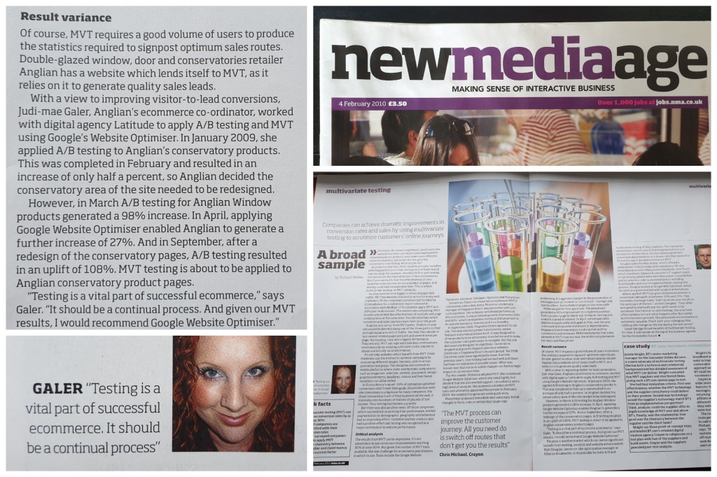 In 2010, Judi-mae was responsible for bringing in millions of pounds of revenue for Anglian Home Improvements each year and used all technologies and tools available to her in order to be as effective as possible. She was interviewed by New Media Age, a marketing and insights magazine, about her successes with A/B and MVT testing on websites using Google Website Optimiser.