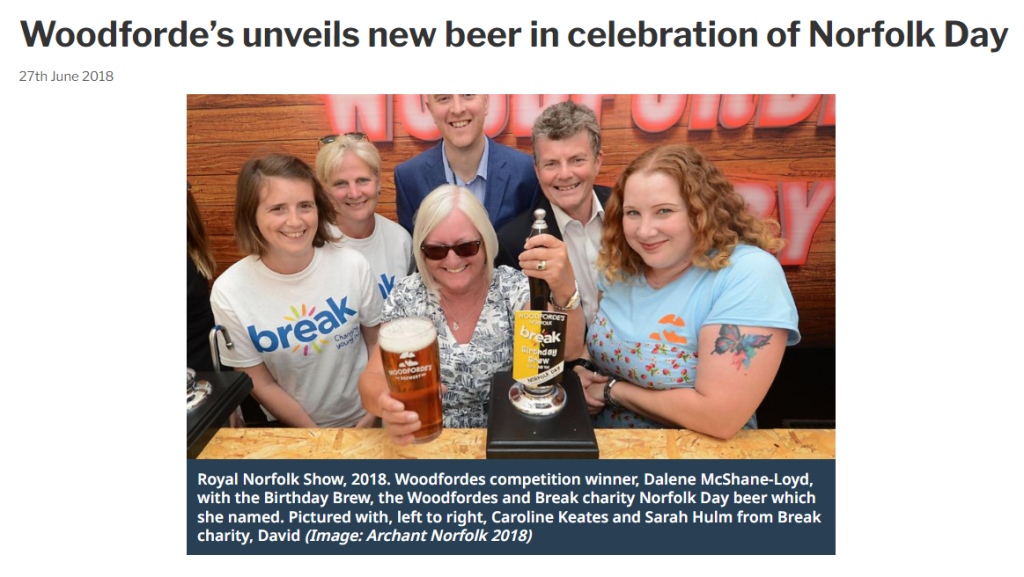 Judi-mae also worked hard for Woodforde’s Brewery to secure brand building press activity during the summer of 2018 via events at the brewery, beer naming competitions and relationships with local charities. Two such successes were the Break Charity beer naming competition at the Norfolk Show and a Norfolk Day celebration at the brewery in Woodbastwick.