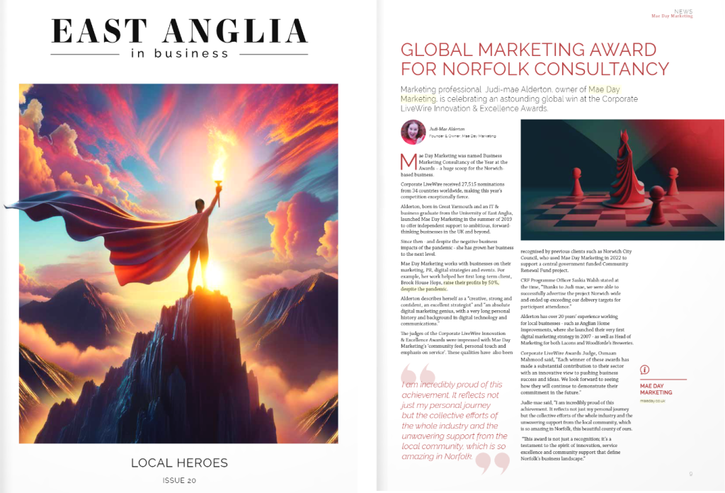 The 20th Issue of ‘East Anglia in Business’ magazine came out on 12th January 2024 and was a ‘Local Heroes’ edition. Mae Day Marketing was featured as one of the local businesses to watch! You can read the full article here, on Page 9.