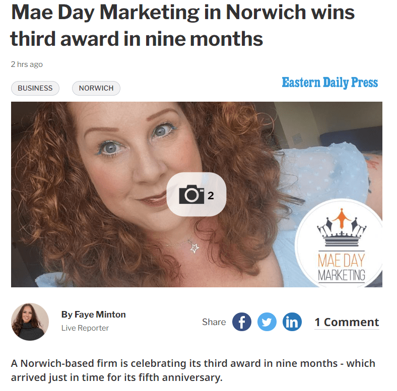 Local newspapers, the Eastern Daily Press and the Norwich Evening News picked up the story of Mae Day Marketing’s June 2024 win.