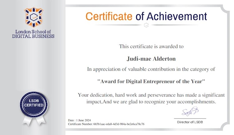 We extend our heartfelt congratulations to Judi-mae Alderton and celebrate her remarkable accomplishments. Her journey and success serve as a beacon of inspiration for aspiring digital entrepreneurs, highlighting the endless possibilities within the digital business arena.”