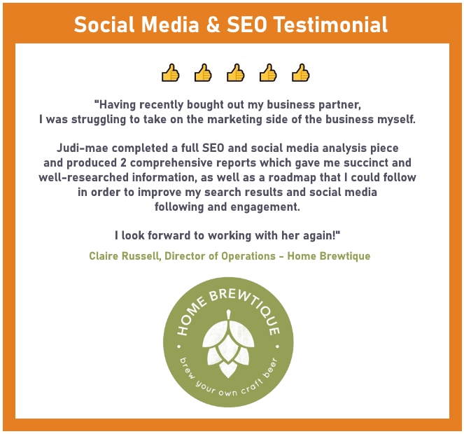 “I met Judi-mae on a Hop Walk in September 2019 and after a brief chat over lunch thought that she would be the right person to help me with my boutique home brew kit business. Having recently bought out my business partner (who was in charge of all the SEO and social media), I was struggling to take on this side of the business myself.