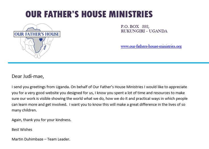 “Greetings from Uganda. On behalf of Our Father’s House Ministries I would like to appreciate you for a very good website you designed for us, I know you spent a lot of time and resources to make sure our work is visible showing the world what we do, how we do it and practical ways in which people can learn more and get involved. I want you to know this will make a great difference in the lives of so many children.