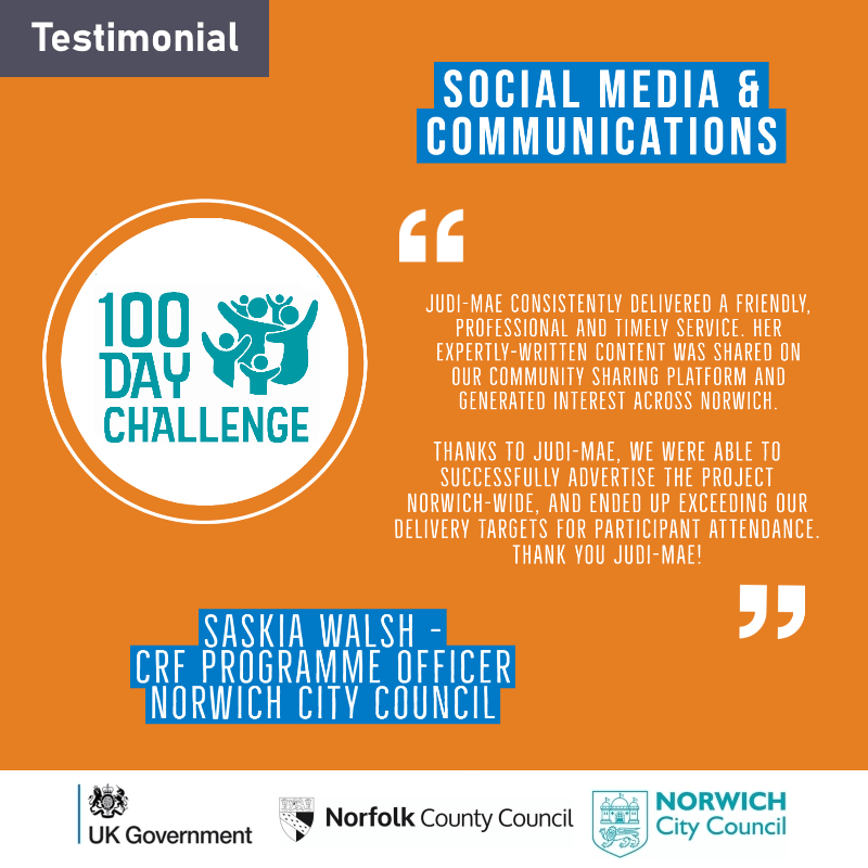 “We recruited Mae Day Marketing to curate and schedule our social media content for Norwich’s 100 Day Challenge, a series of free workshops for Norwich residents made possible via the Community Renewal Fund.