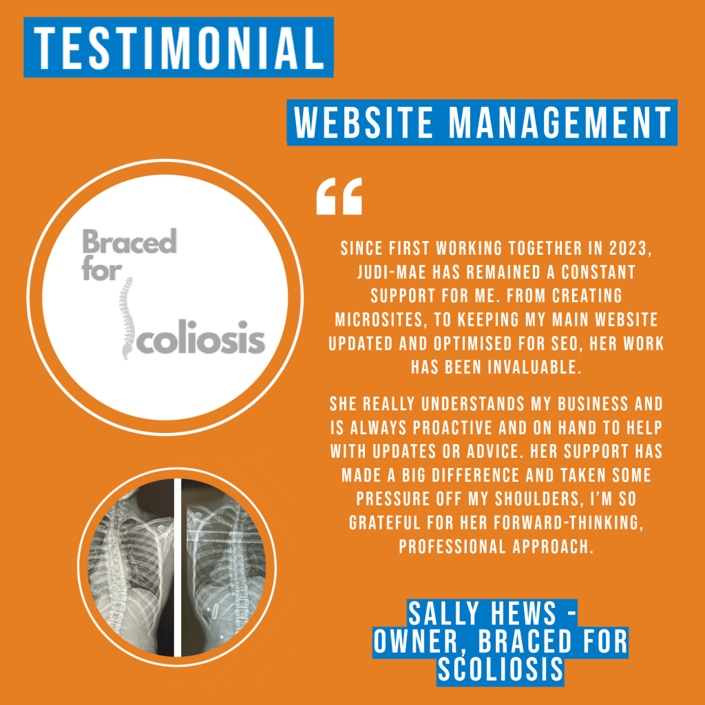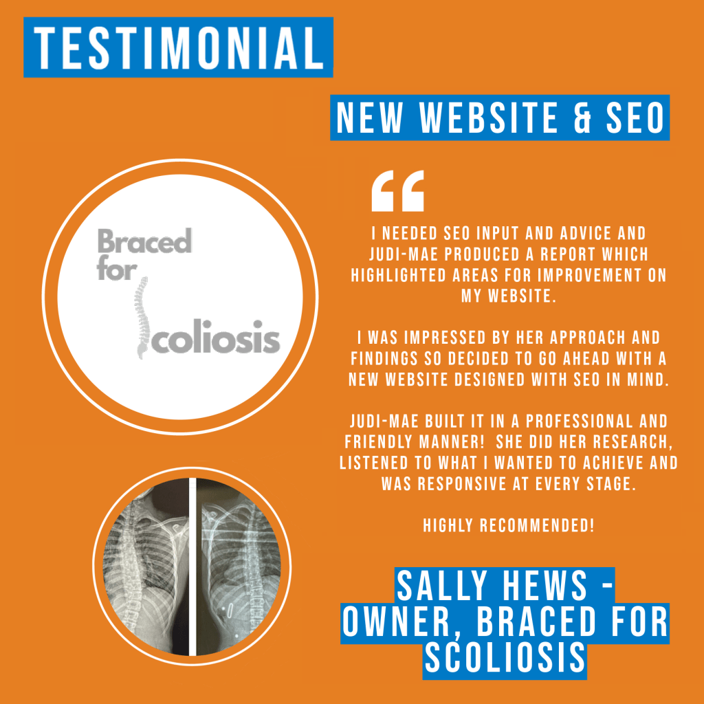 “Judi-mae has been really helpful in supporting and growing my business, Braced for Scoliosis. We started working together nearly 2 years ago, when she assisted me in April 2023 with some SEO work, which lead to a new website project.