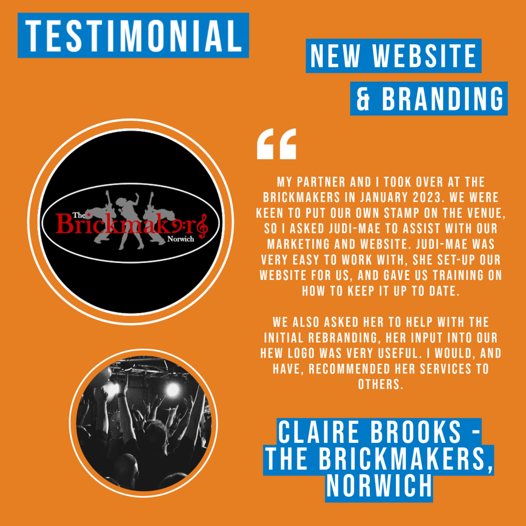 “My partner and I took over at the Brickmakers in January 2023. We were keen to put our own stamp on the venue, so I asked Judi-mae to assist with our marketing and website. Judi-mae was very easy to work with, she set-up our website for us, and gave us training on how to keep it up to date.